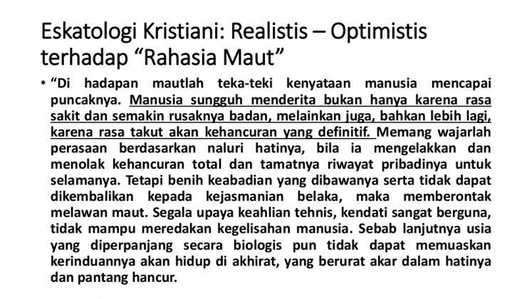 - Eskatologi Kristiani: Realistis – Optimistis terhadap “Rahasia Maut” • “Di hadapan mautlah teka-teki kenyataan manusia mencapai puncaknya. Manusia sungguh menderita bukan hanya karena rasa sakit dan semakin rusaknya badan, melainkan juga, bahkan lebih lagi, karena rasa takut akan kehancuran yang definitif. Memang wajarlah perasaan berdasarkan naluri hatinya, bila ia mengelakkan dan menolak kehancuran total dan tamatnya riwayat pribadinya untuk selamanya. Tetapi benih keabadian yang dibawanya serta tidak dapat dikembalikan kepada kejasmanian belaka, maka memberontak melawan maut. Segala upaya keahlian tehnis, kendati sangat berguna, tidak mampu meredakan kegelisahan manusia. Sebab lanjutnya usia yang diperpanjang secara biologis pun tidak dapat memuaskan kerinduannya akan hidup di akhirat, yang berurat akar dalam hatinya dan pantang hancur.