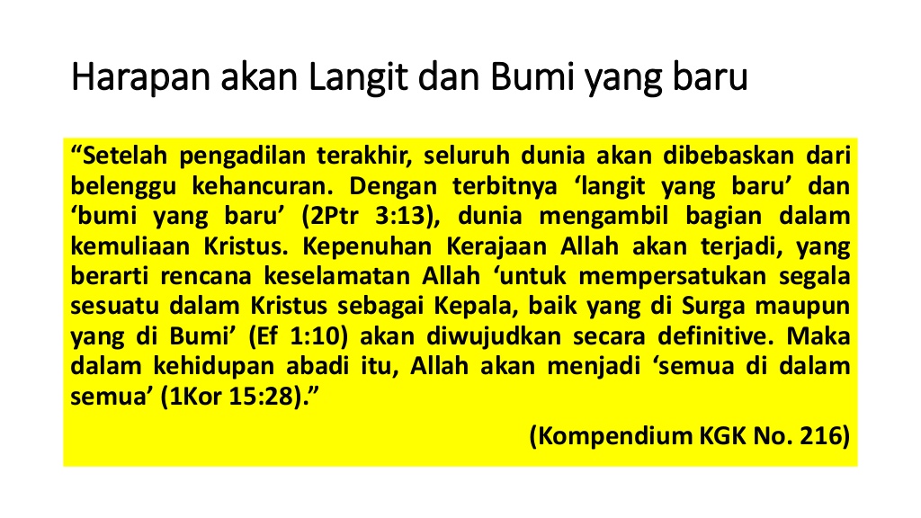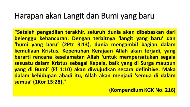 - Harapan akan Langit dan Bumi yang baru “Setelah pengadilan terakhir, seluruh dunia akan dibebaskan dari belenggu kehancuran. Dengan terbitnya ‘langit yang baru’ dan ‘bumi yang baru’ (2Ptr 3:13), dunia mengambil bagian dalam kemuliaan Kristus. Kepenuhan Kerajaan Allah akan terjadi, yang berarti rencana keselamatan Allah ‘untuk mempersatukan segala sesuatu dalam Kristus sebagai Kepala, baik yang di Surga maupun yang di Bumi’ (Ef 1:10) akan diwujudkan secara definitive. Maka dalam kehidupan abadi itu, Allah akan menjadi ‘semua di dalam semua’ (1Kor 15:28).” (Kompendium KGK No. 216)