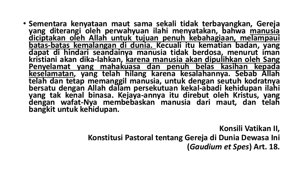 - • Sementara kenyataan maut sama sekali tidak terbayangkan, Gereja yang diterangi oleh perwahyuan ilahi menyatakan, bahwa manusia diciptakan oleh Allah untuk tujuan penuh kebahagiaan, melampaui batas-batas kemalangan di dunia. Kecuali itu kematian badan, yang dapat di hindari seandainya manusia tidak berdosa, menurut iman kristiani akan dika-lahkan, karena manusia akan dipulihkan oleh Sang Penyelamat yang mahakuasa dan penuh belas kasihan kepada keselamatan, yang telah hilang karena kesalahannya. Sebab Allah telah dan tetap memanggil manusia, untuk dengan seutuh kodratnya bersatu dengan Allah dalam persekutuan kekal-abadi kehidupan ilahi yang tak kenal binasa. Kejaya-annya itu direbut oleh Kristus, yang dengan wafat-Nya membebaskan manusia dari maut, dan telah bangkit untuk kehidupan. Konsili Vatikan II, Konstitusi Pastoral tentang Gereja di Dunia Dewasa Ini (Gaudium et Spes) Art. 18.