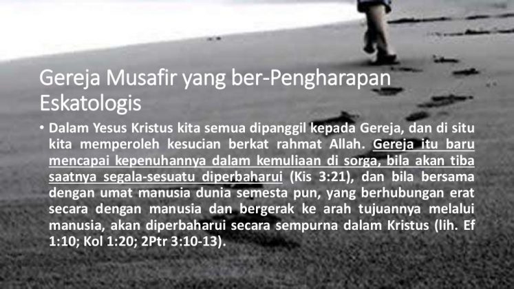 - Gereja Musafir yang ber-Pengharapan Eskatologis • Dalam Yesus Kristus kita semua dipanggil kepada Gereja, dan di situ kita memperoleh kesucian berkat rahmat Allah. Gereja itu baru mencapai kepenuhannya dalam kemuliaan di sorga, bila akan tiba saatnya segala-sesuatu diperbaharui (Kis 3:21), dan bila bersama dengan umat manusia dunia semesta pun, yang berhubungan erat secara dengan manusia dan bergerak ke arah tujuannya melalui manusia, akan diperbaharui secara sempurna dalam Kristus (lih. Ef 1:10; Kol 1:20; 2Ptr 3:10-13).