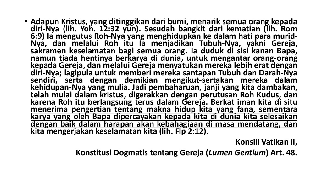 - • Adapun Kristus, yang ditinggikan dari bumi, menarik semua orang kepada diri-Nya (lih. Yoh. 12:32 yun). Sesudah bangkit dari kematian (lih. Rom 6:9) Ia mengutus Roh-Nya yang menghidupkan ke dalam hati para murid- Nya, dan melalui Roh itu Ia menjadikan Tubuh-Nya, yakni Gereja, sakramen keselamatan bagi semua orang. Ia duduk di sisi kanan Bapa, namun tiada hentinya berkarya di dunia, untuk mengantar orang-orang kepada Gereja, dan melalui Gereja menyatukan mereka lebih erat dengan diri-Nya; lagipula untuk memberi mereka santapan Tubuh dan Darah-Nya sendiri, serta dengan demikian mengikut-sertakan mereka dalam kehidupan-Nya yang mulia. Jadi pembaharuan, janji yang kita dambakan, telah mulai dalam kristus, digerakkan dengan perutusan Roh Kudus, dan karena Roh itu berlangsung terus dalam Gereja. Berkat iman kita di situ menerima pengertian tentang makna hidup kita yang fana, sementara karya yang oleh Bapa dipercayakan kepada kita di dunia kita selesaikan dengan baik dalam harapan akan kebahagiaan di masa mendatang, dan kita mengerjakan keselamatan kita (lih. Flp 2:12). Konsili Vatikan II, Konstitusi Dogmatis tentang Gereja (Lumen Gentium) Art. 48.