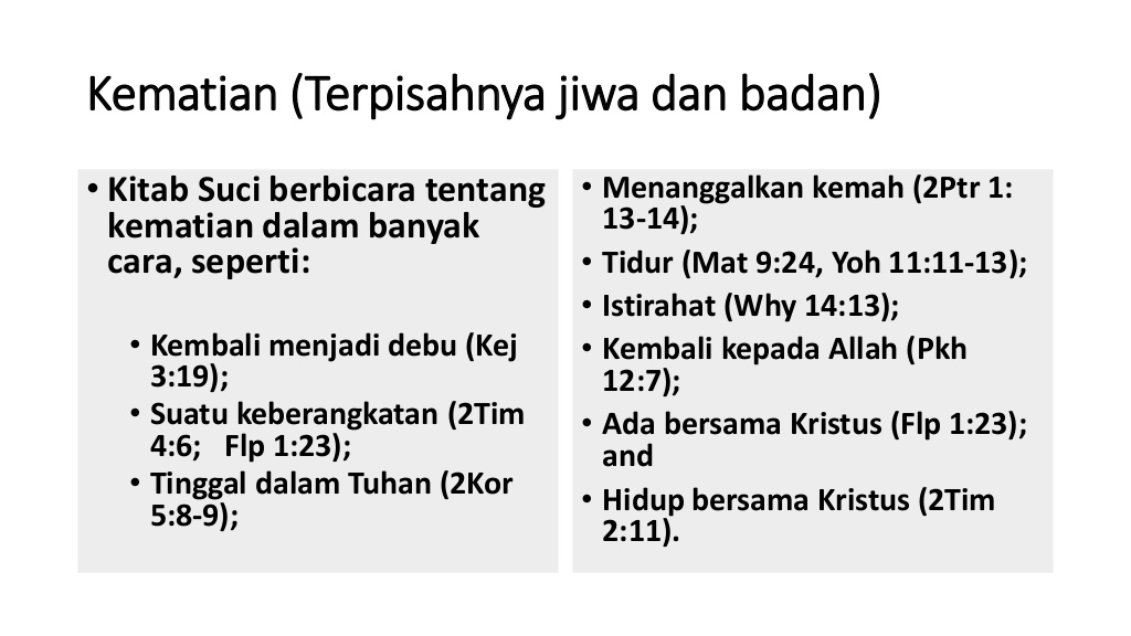 - Kematian (Terpisahnya jiwa dan badan) • Kitab Suci berbicara tentang kematian dalam banyak cara, seperti: • Kembali menjadi debu (Kej 3:19); • Suatu keberangkatan (2Tim 4:6; Flp 1:23); • Tinggal dalam Tuhan (2Kor 5:8-9); • Menanggalkan kemah (2Ptr 1: 13-14); • Tidur (Mat 9:24, Yoh 11:11-13); • Istirahat (Why 14:13); • Kembali kepada Allah (Pkh 12:7); • Ada bersama Kristus (Flp 1:23); and • Hidup bersama Kristus (2Tim 2:11).