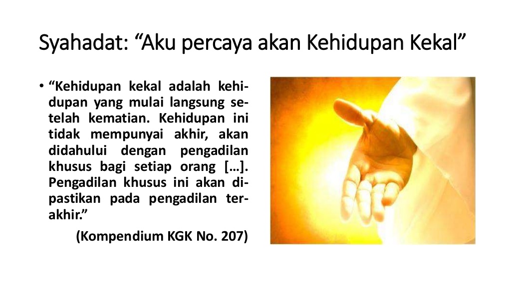 - Syahadat: “Aku percaya akan Kehidupan Kekal” • “Kehidupan kekal adalah kehi- dupan yang mulai langsung se- telah kematian. Kehidupan ini tidak mempunyai akhir, akan didahului dengan pengadilan khusus bagi setiap orang […]. Pengadilan khusus ini akan di- pastikan pada pengadilan ter- akhir.” (Kompendium KGK No. 207)