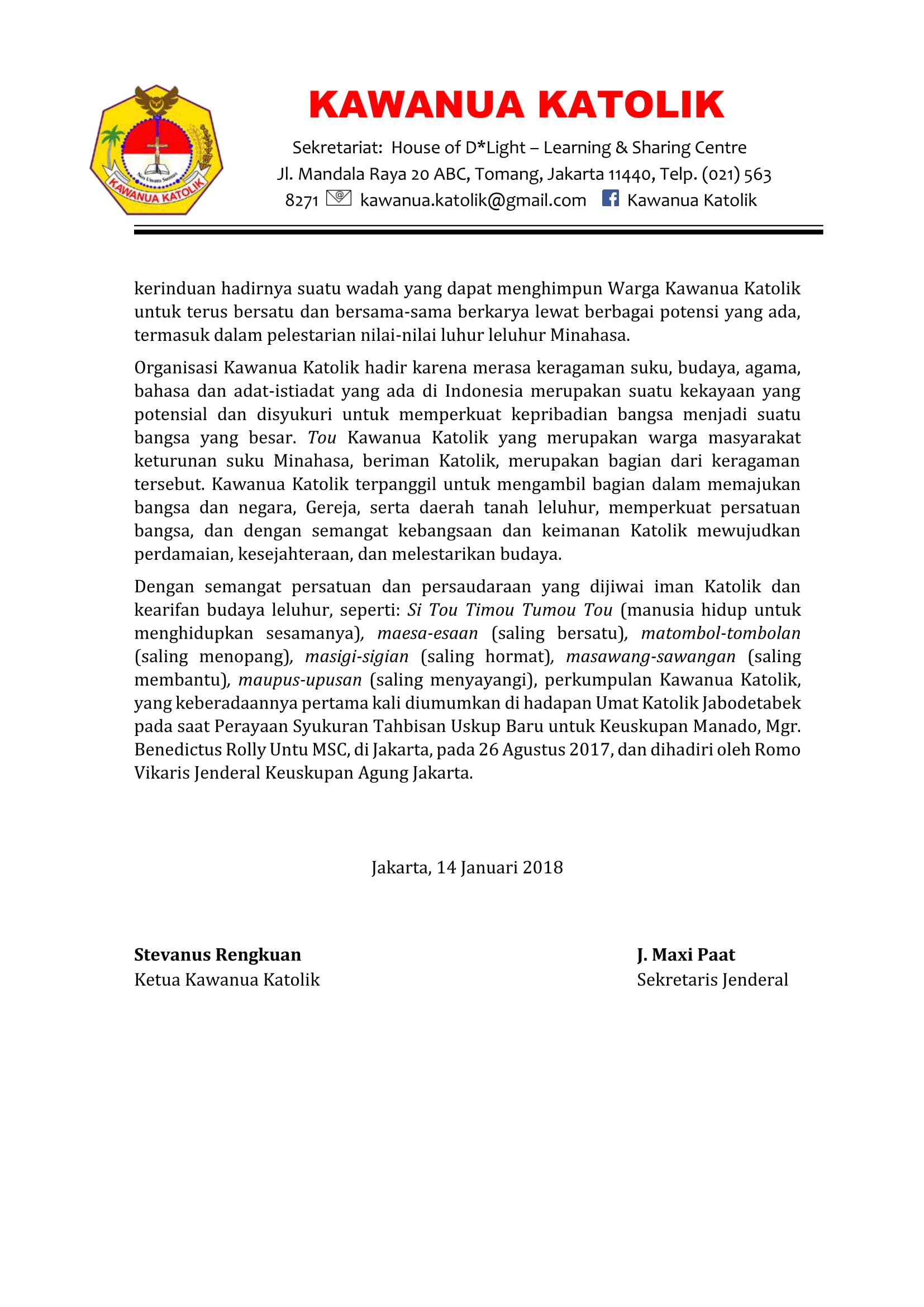 J. Maxi Paat (Sekretaris Jenderal KK) menjelaskan arti KK, berasal dari dua “ikatan” kata, “Kawanua” yaitu orang yang berasal dari suku atau daerah Manado/ Minahasa dan berada di tanah rantau, dan “Katolik”, yang memeluk agama Katolik.