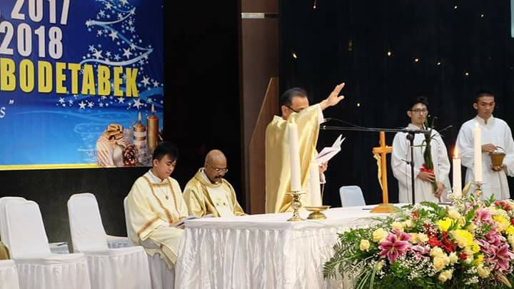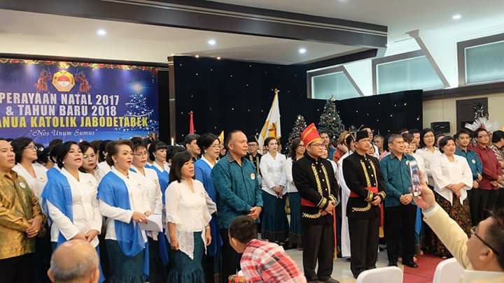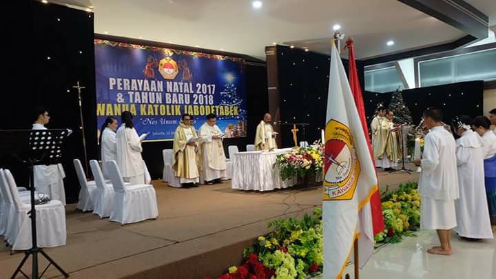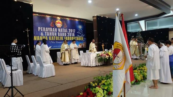 HIDUPKATOLIK.com – Warga Kawanua Katolik (KK) yang berdomisili di Jakarta, Bogor, Depok, Tangerang dan Bekasi (Jabodetabek) mengadakan perayaan Misa Natal 2017 dan Tahun Baru 2018 di Graha Zeni Direktorat Jenderal Angkatan Darat, Matraman, Jakarta pada Minggu (14/01).