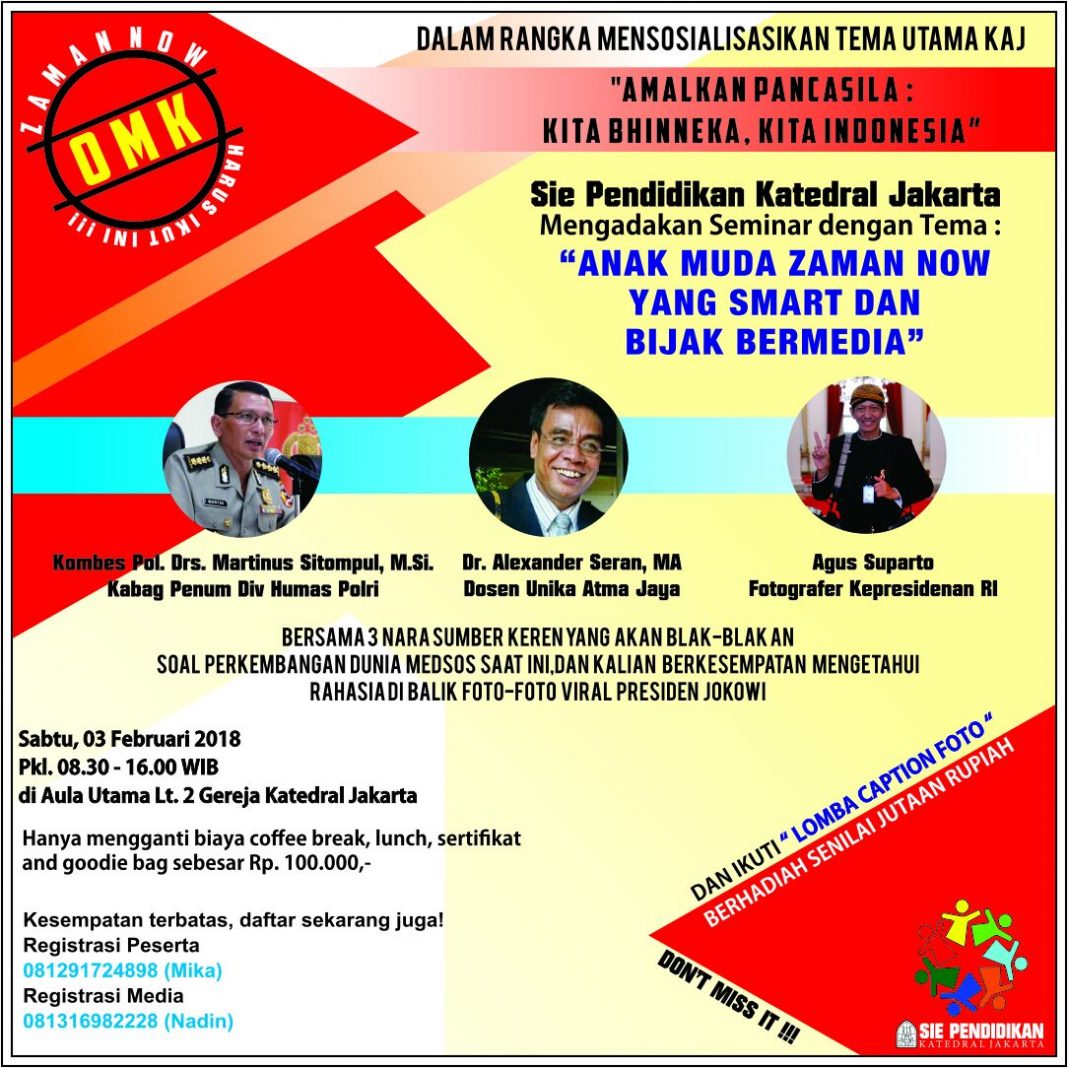 Kalau mau tahu, Anda bisa ikut dalam seminar yang akan diadakan pada Sabtu (3/2) mendatang di Aula Utama Paroki Katedral, Jakarta. Kegiatan yang diadakan oleh Sie Pendidikan Paroki Katedral ini menghadirkan tiga nara sumber. Antara lain Kombes Pol. Drs, Martinus Sitompul, M. Si (Kabag Penum Div. Humas Polri), Dr. Alexander Seran, MA (Dosen Unika Atma Jaya Jakarta), dan Agus Suparto (Fotografer Pribadi Presiden Jokowi).