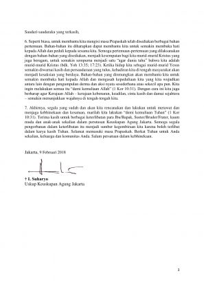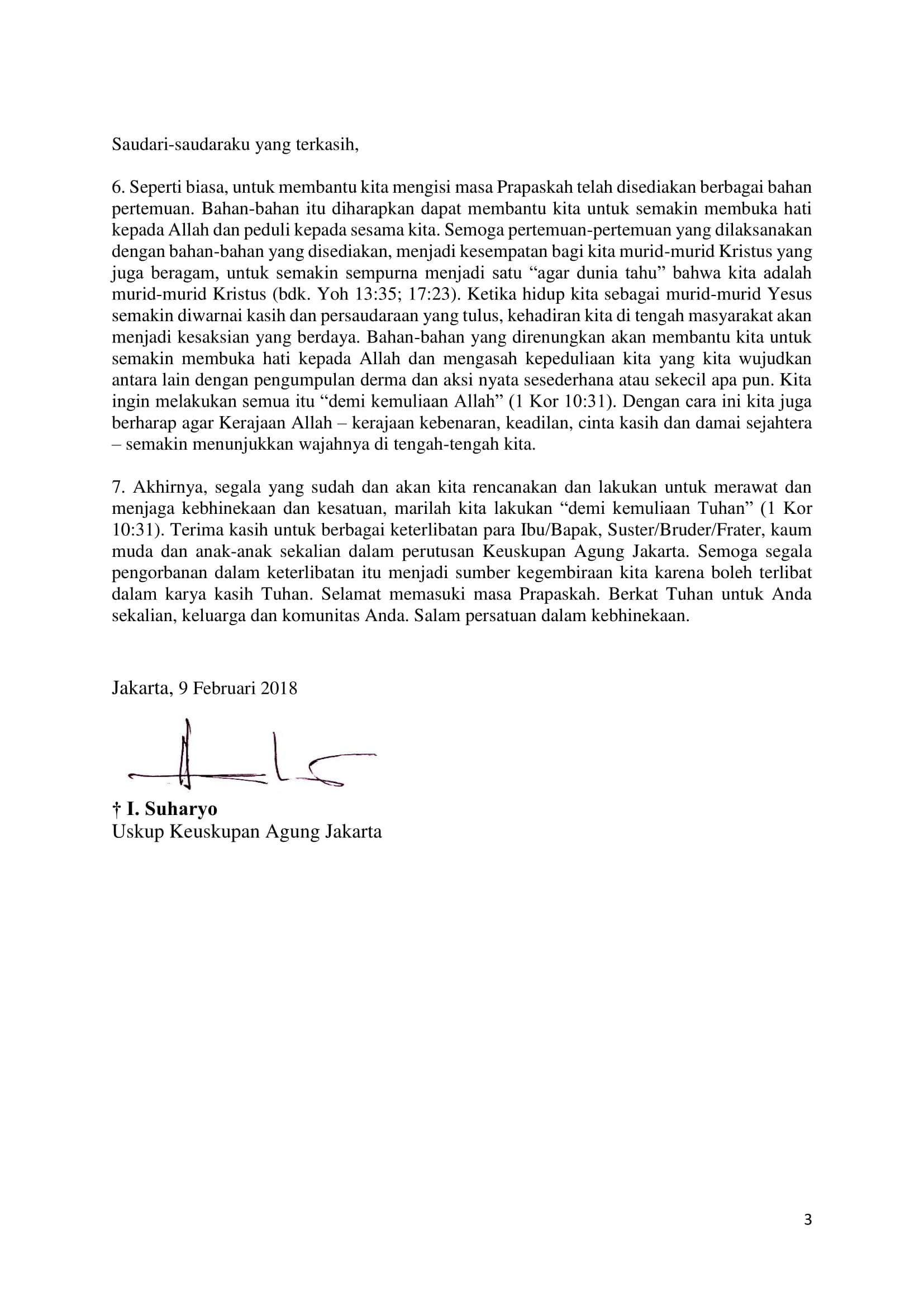 7. Akhirnya, segala yang sudah dan akan kita rencanakan dan lakukan untuk merawat dan menjaga kebhinekaan dan kesatuan, marilah kita lakukan “demi kemuliaan Tuhan” (1 Kor 10:31). Terima kasih untuk berbagai keterlibatan para Ibu/Bapak, Suster/Bruder/Frater, kaum muda dan anak-anak sekalian dalam perutusan Keuskupan Agung Jakarta. Semoga segala pengorbanan dalam keterlibatan itu menjadi sumber kegembiraan kita karena boleh terlibat dalam karya kasih Tuhan. Selamat memasuki masa Prapaskah. Berkat Tuhan untuk Anda sekalian, keluarga dan komunitas Anda. Salam persatuan dalam kebhinekaan.