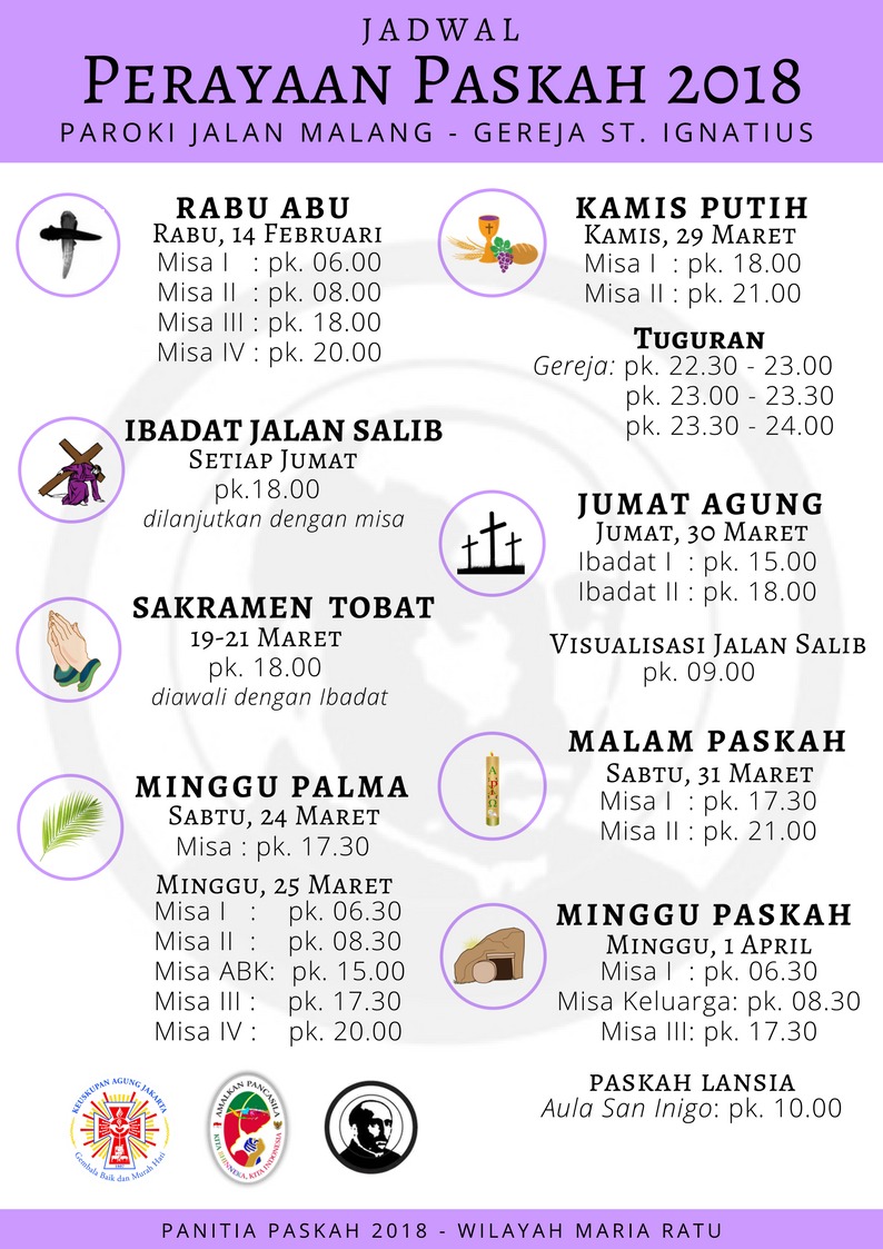 - Paroki Jalan Malang, Gereja St.Ignatius; 06.00, 08.00, 18.00, 20.00