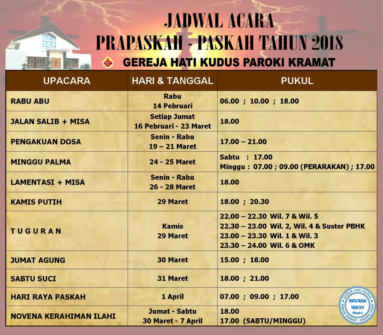 - Paroki Kramat, Gereja Hati Kudus: 06.00, 10.00, 18.00
