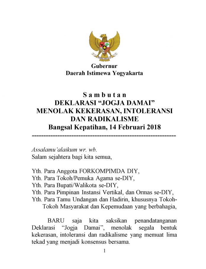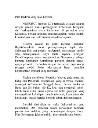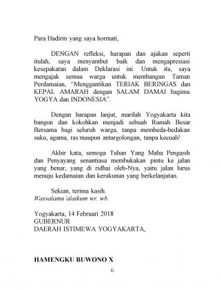 DENGAN refleksi, harapan dan ajakan seperti itulah, saya menyambut baik dan mengapresiasi kesepakatan dalam Deklarasi ini. Untuk itu, saya mengajak semua warga untuk membangun Taman Perdamaian, “Menggantikan TERIAK BERINGAS dan KEPAL AMARAH dengan SALAM DAMAI bagimu YOGYA dan INDONESIA”.