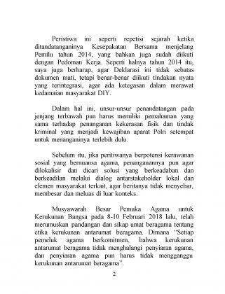Peristiwa ini seperti repetisi sejarah ketika ditandatanganinya Kesepakatan Bersama menjelang Pemilu tahun 2014, yang bahkan juga sudah diikuti dengan Pedoman Kerja. Seperti halnya tahun 2014 itu, saya juga berharap, agar Deklarasi ini tidak sebatas dokumen mati, tetapi benar-benar diikuti tindakan nyata yang terintegrasi, agar ada ketegasan dalam merawat kedamaian masyarakat DIY.