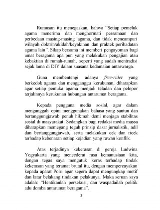 Atas terjadinya kekerasan di gereja Ludwina Yogyakarta yang mencederai rasa kemanusiaan kita, dengan tegas saya mengutuk keras terhadap tindak kekerasan yang teramat brutal itu, dengan mempercayakan kepada aparat Polri agar segera dapat mengungkap motif dan latar belakang tindakan pelakunya. Maka seruan saya adalah: “Hentikanlah persekusi, dan waspadailah politik adu domba antarumat beragama”.