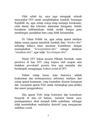 Meski DIY bukan peserta Pilkada Serentak, suatu peristiwa di luar DIY yang terpicu oleh ucapan atau tindakan provokatif peserta bisa saja menjalar dan berdampak mengganggu kohesi sosial di DIY.