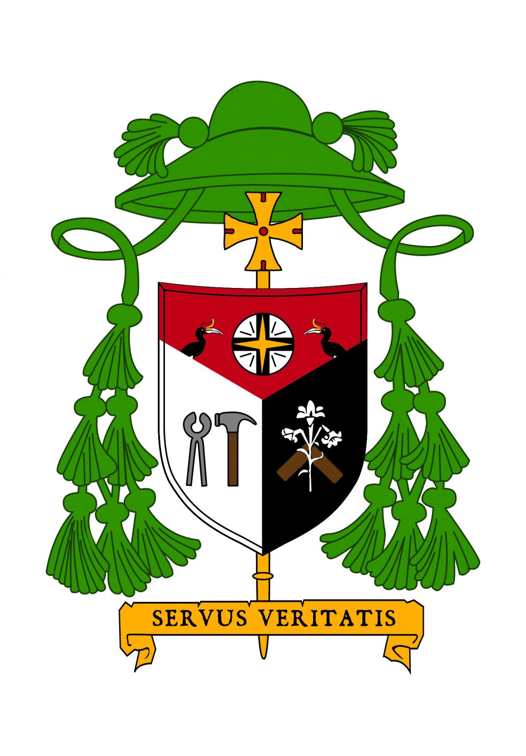 Di atas perisai ditempatkan sebuah galero atau topi khas klerus berwarna hijau, dengan enam jumbai di masing-masing sisinya. Di bagian tengah belakang perisai adalah sebuah salib pancang berwarna kuning keemasan. Galero hijau dengan enam jumbai berikut salib pancang ini merupakan penanda bahwa sang empunya lambang adalah seorang uskup. [Anak Guru Jadi Uskup Tanjung Selor]