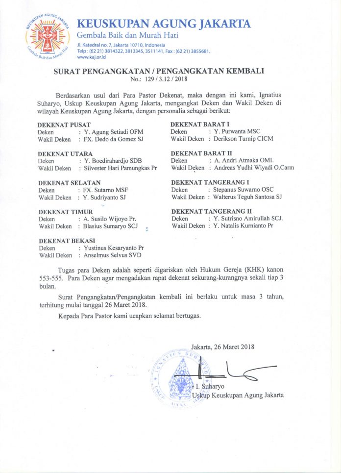 HIDUPKATOLIK.com – Keuskupan Agung Jakarta (KAJ) melalui Uskup KAJ, Mgr. I.Suharyo tertanggal 26 Maret 2018, No.: 129/3.12/2018 mengeluarkan Surat Pengangkatan / Pengangkatan Kembali Deken (Ketua Dekenat) dan Wakil Deken di wilayah KAJ.