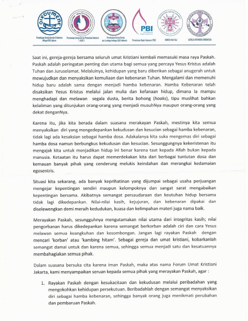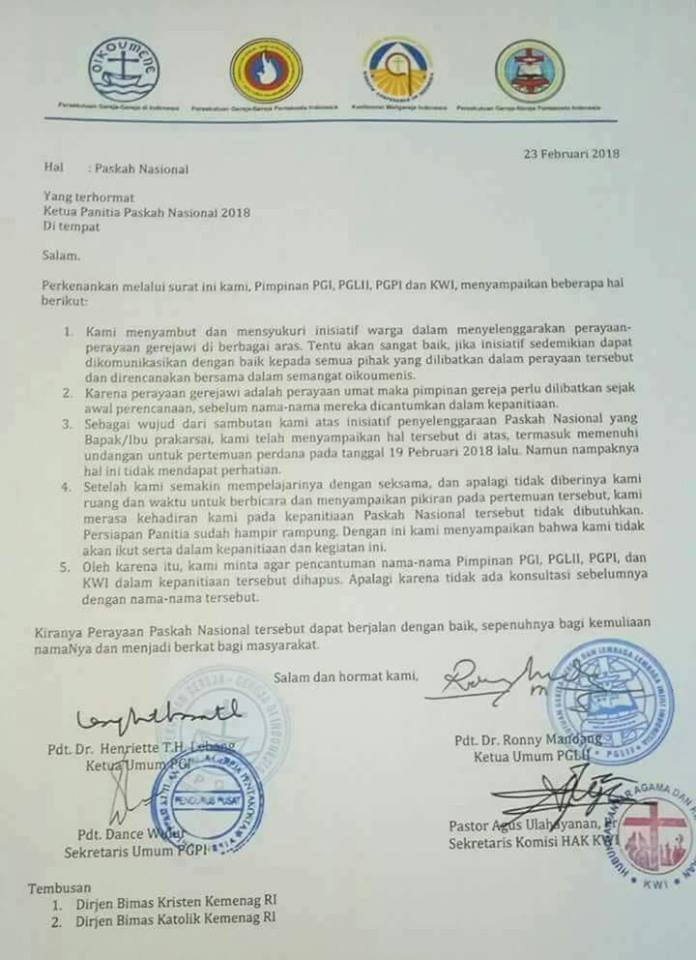 Dibawah ini surat yang ditujukan kepada Ketua Panitia Paskah Nasional 2018, meminta agar pencantuman nama-nama Pimpinan PGI, PGLII, PGPI dan KWI dalam kepanitiaan tersebut dihapuskan.