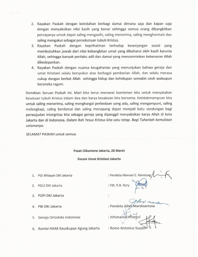 Pastor Suyadi dalam penjelasannya mengenai aras Gereja, menyampaikan bahwa Gereja Kristen yang terdiri dari beberapa gereja, bersatu dalam sinode. Beberapa sinode itu bersatu dan tergabung dalam aras PGI. Catatan Konferensi Pers pertemuan tersebut telah dituangkan dalam surat Ucapan Paskah Kristen-Katolik dibawah ini: Selamat menyambut Paskah, semoga damai dan sukacita kebangkitan Kristus tetap tinggal, bertumbuh, dan berbuah, kini dan senantiasa.   AB