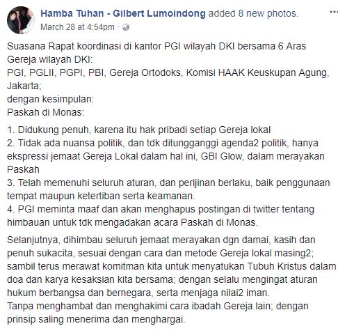 Dilansir dari akun facebook, pada 28/3 (pukul 4.54 sore), Pdt.Gilbert menuliskan tentang dukungan penuh untuk rencana acara Paskah di Monas, salah satunya adalah dari Komisi HAAK Keuskupan Agung Jakarta. Dengan demikian umat Katolik dapat memperoleh gambaran lebih jelas mengenai kesimpang-siuran informasi yang ada seputar perayaan Paskah Nasional dan mengambil sikap atas himbauan resmi yang diberikan dari KAJ melalui Seksi HAAK dan KWI.