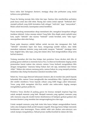 Puasa itu hening menuju laku tobat dan tapa. Saatnya kita memberikan perhatian pada karya amal dan olah tobat. Ruang dan waktu untuk sejenak “berbenah diri”’ menjadi pribadi yang lebih bermakna baik sebagai “’individu”’ juga “masyarakat”. Bulan untuk bercermin, kesempatan untuk berefleksi.