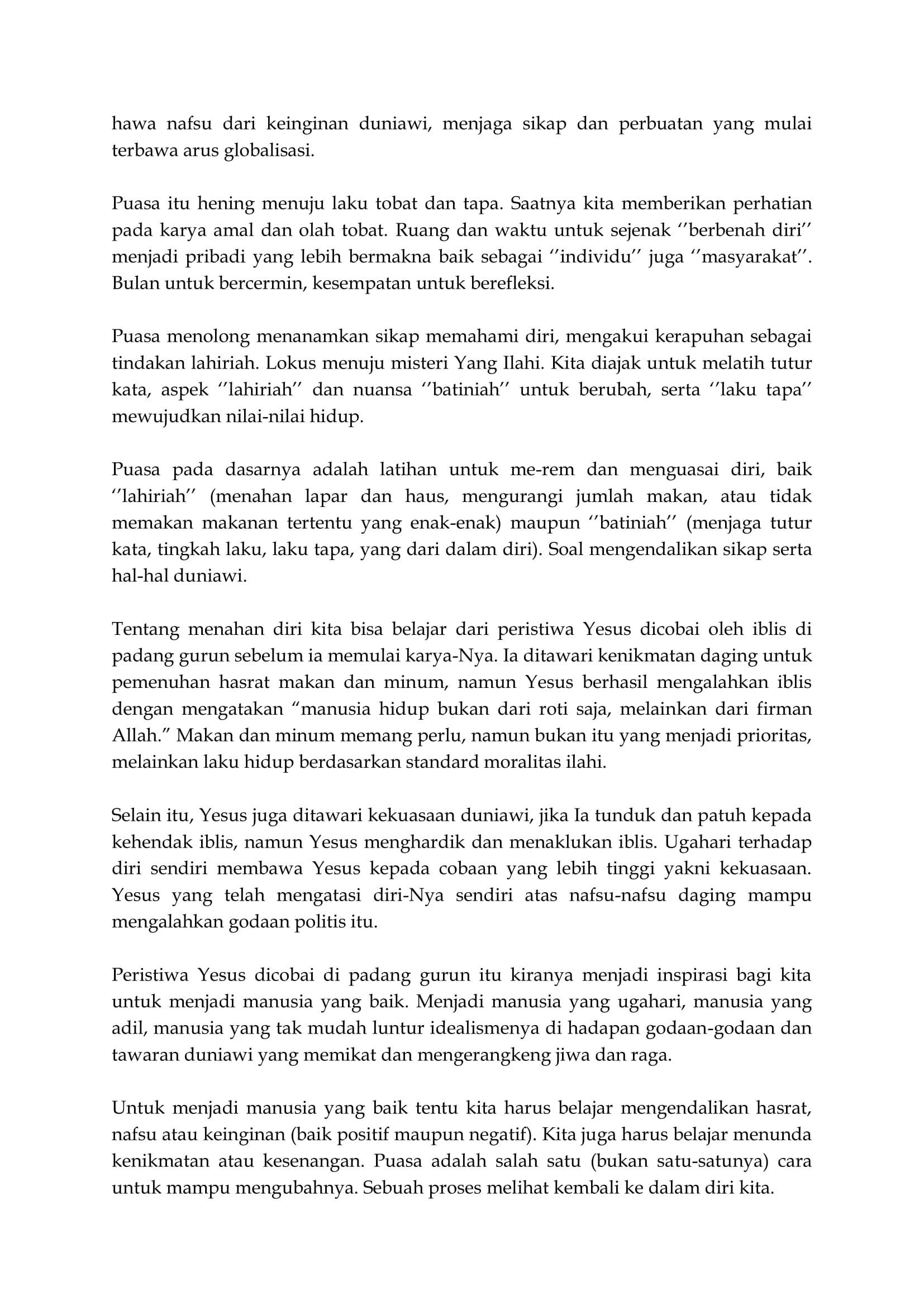 Peristiwa Yesus dicobai di padang gurun itu kiranya menjadi inspirasi bagi kita untuk menjadi manusia yang baik. Menjadi manusia yang ugahari, manusia yang adil, manusia yang tak mudah luntur idealismenya di hadapan godaan-godaan dan tawaran duniawi yang memikat dan mengerangkeng jiwa dan raga.