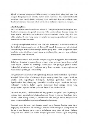 Dalam dunia politik, kita harus kembali ke gagasan dasar politik yaitu kepentingan bersama demi terwujudnya kebaikan bersama (bonum commune). Demokrasi harus kembali pada prinsip dasarnya: universalitas nilai sebagai modal menjamin hak hidup bersama. Ada kesetaraan yang harus diperjuangkan.