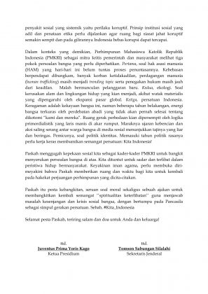 Paskah menggugah kepekaan sosial kita sebagai kader-kader PMKRI untuk bangkit menyerukan persoalan bangsa di atas. Kita dituntut untuk sadar dan terlibat dalam peristiwa hidup bermasyarakat. Keyakinan iman agama, perlu membuka diri-meyakini bahwa Paskah memberikan ruang dan waktu bagi kita untuk kembali pada hakekat perjuangan perhimpunan yang dicita-citakan.
