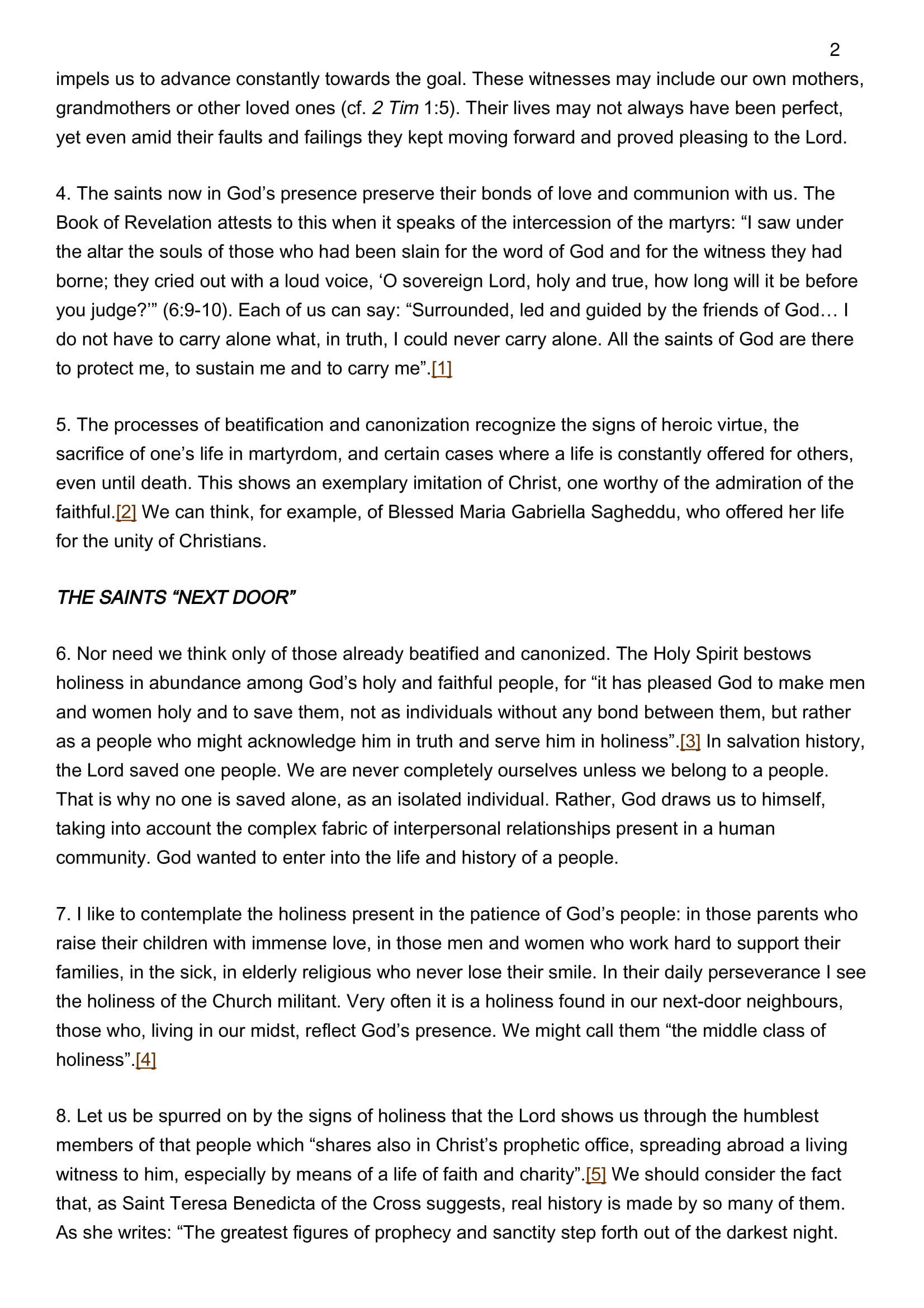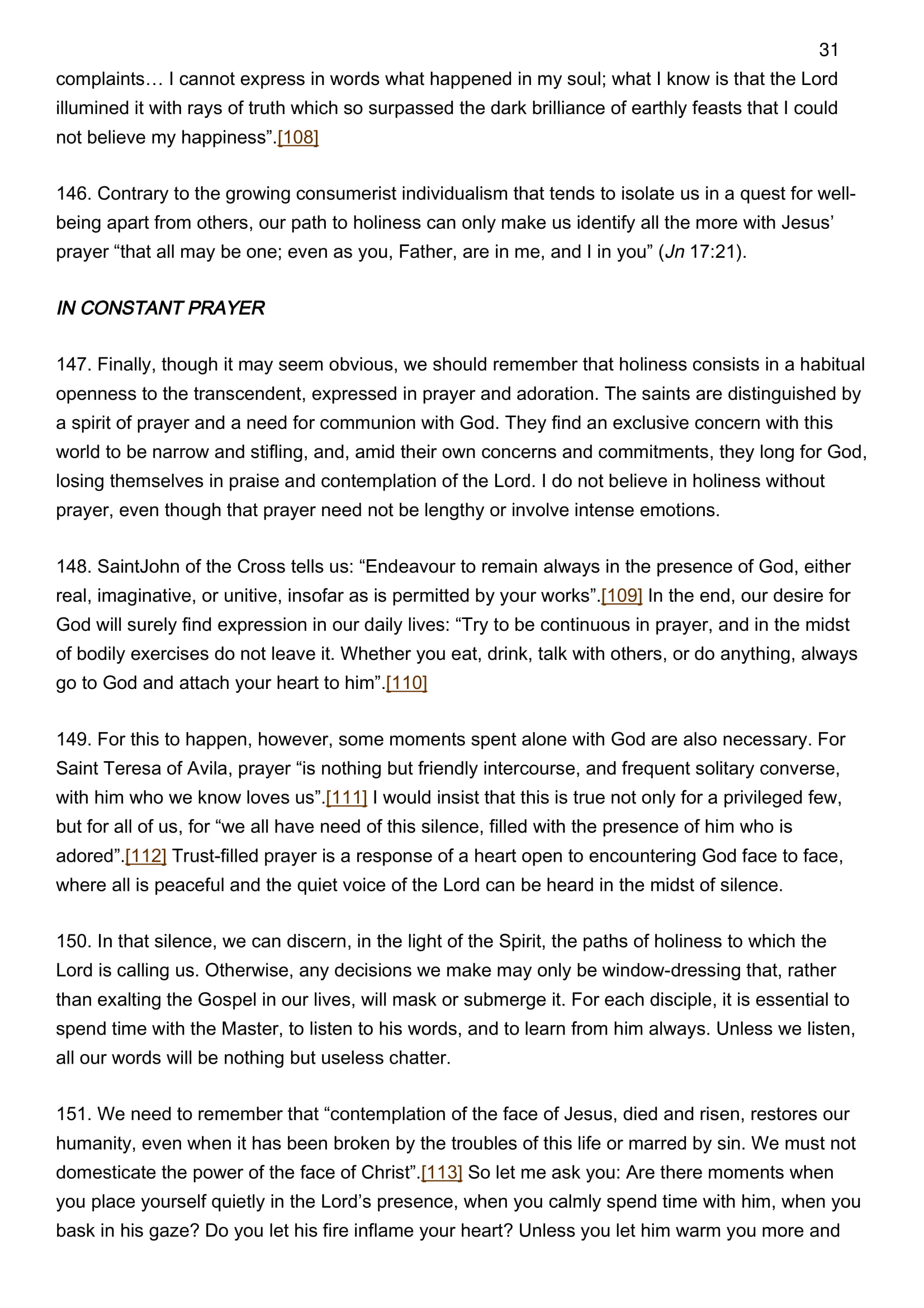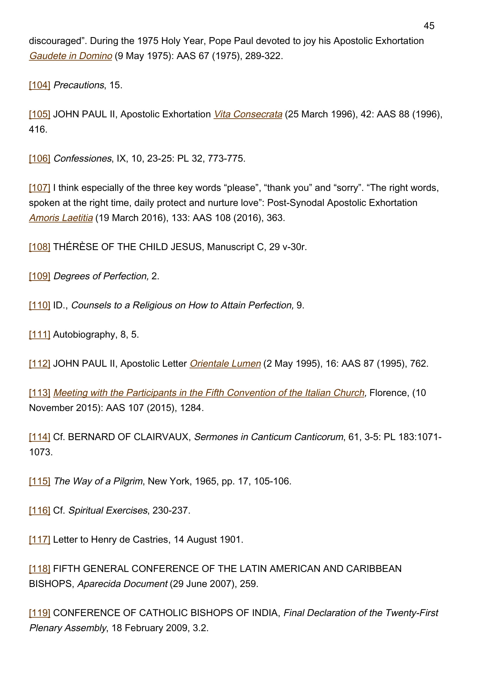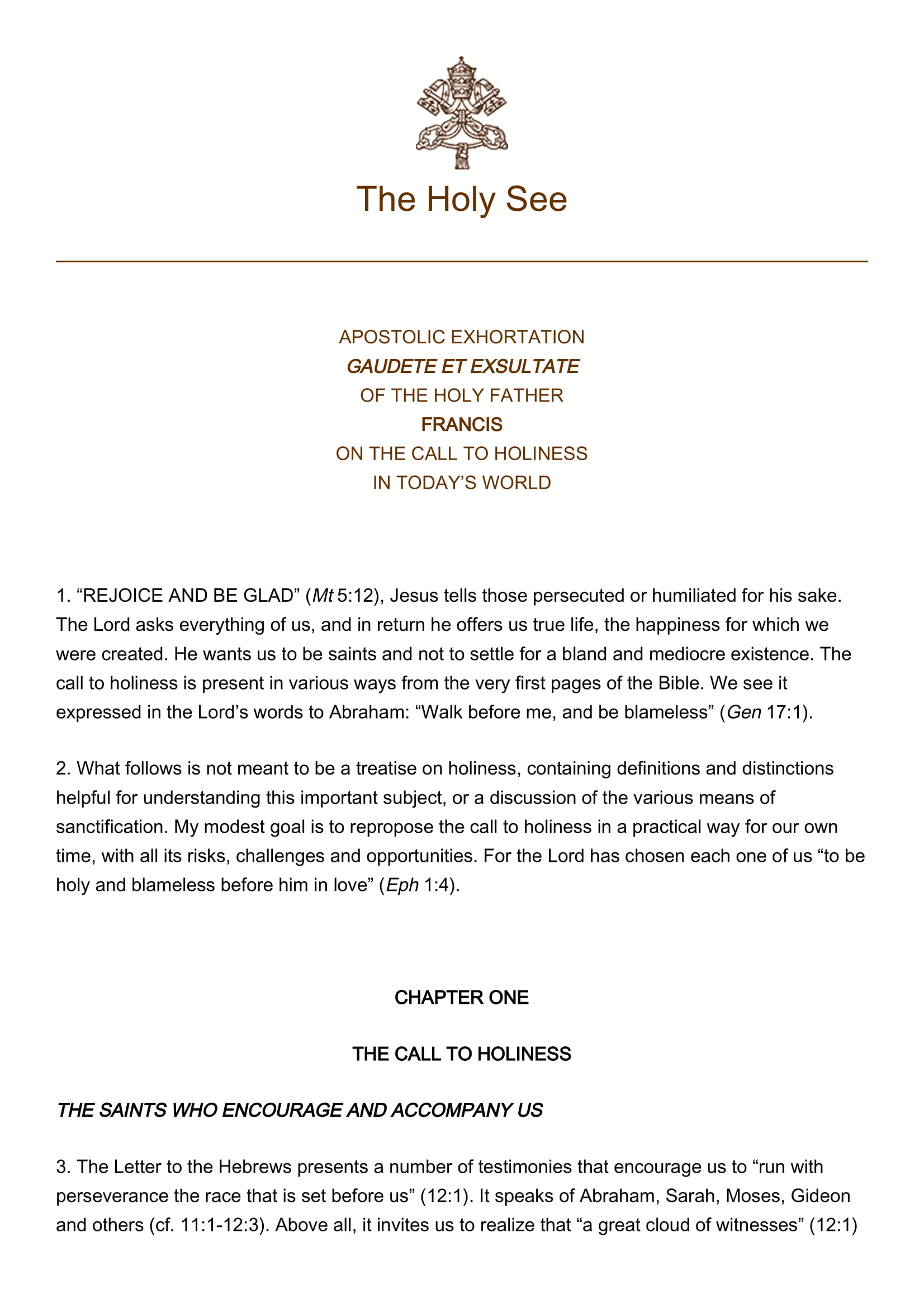 - Bab Satu, Panggilan Kesucian, Orang Kudus yang memberi semangat dan menemani perjalanan kita; pada bab ini terdiri atas 32 ayat dan 2 bab pembuka