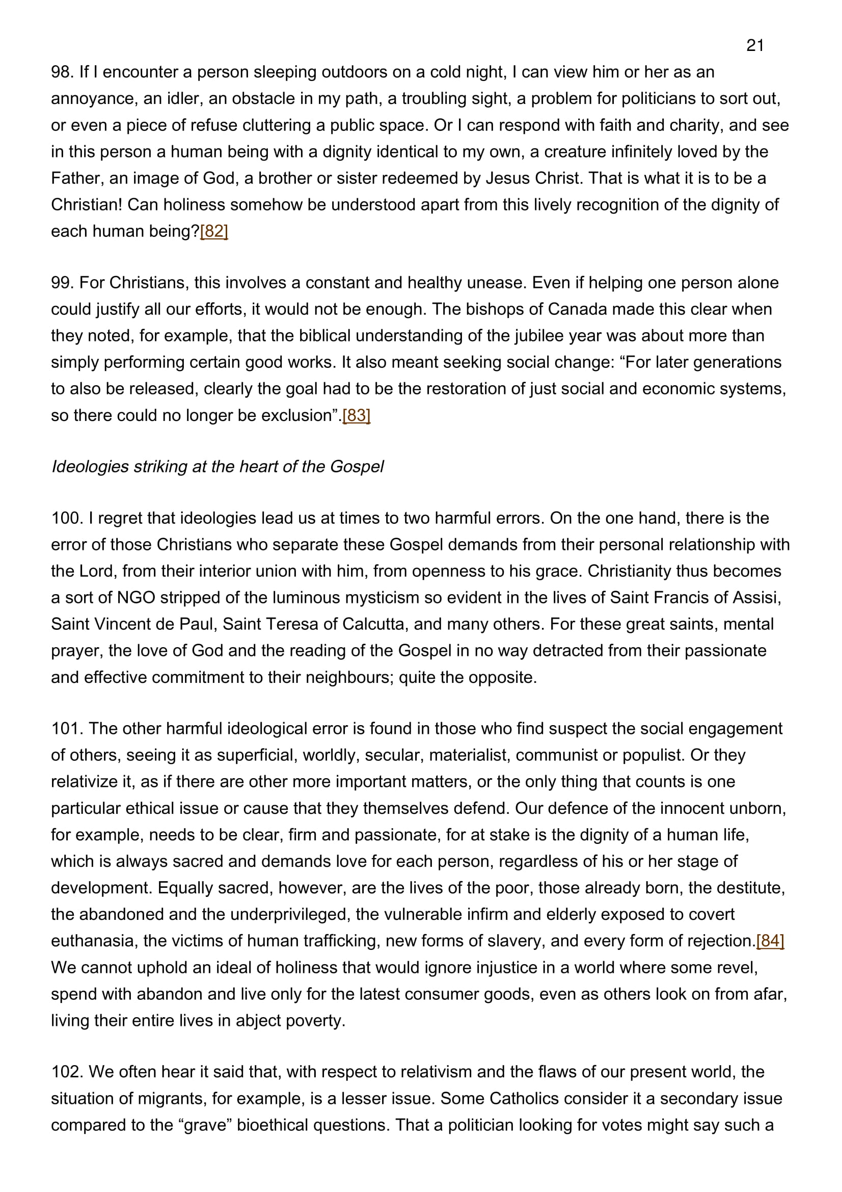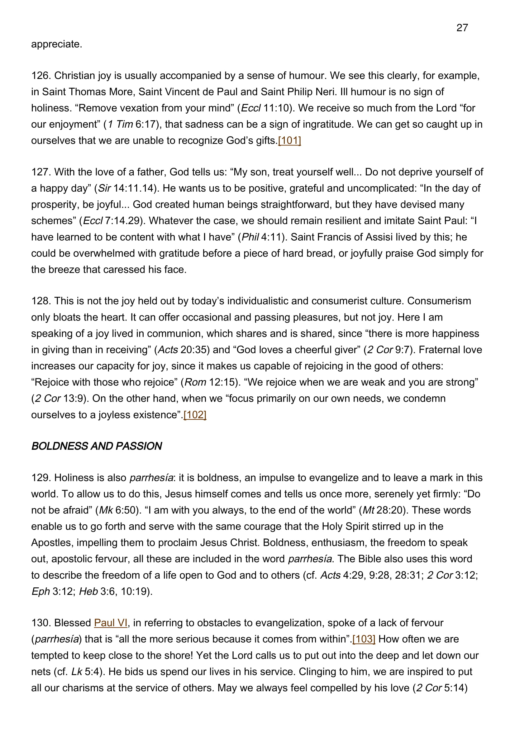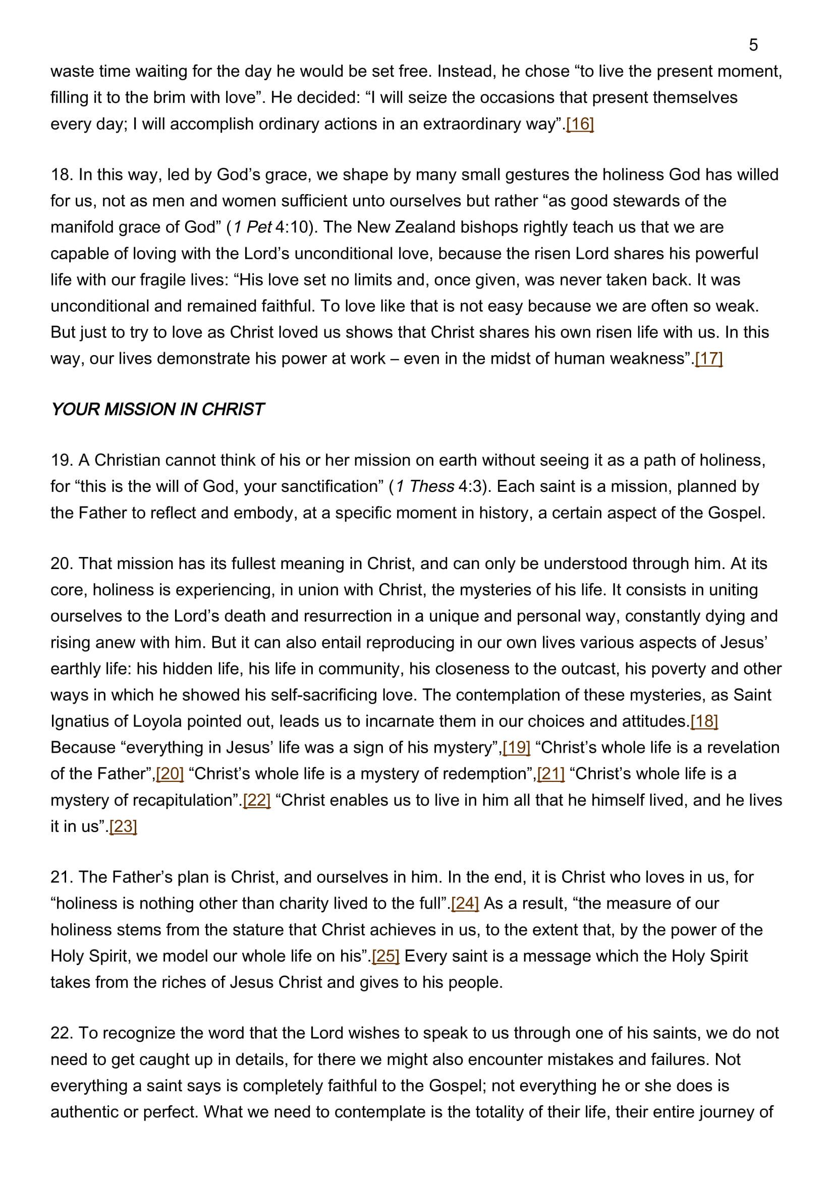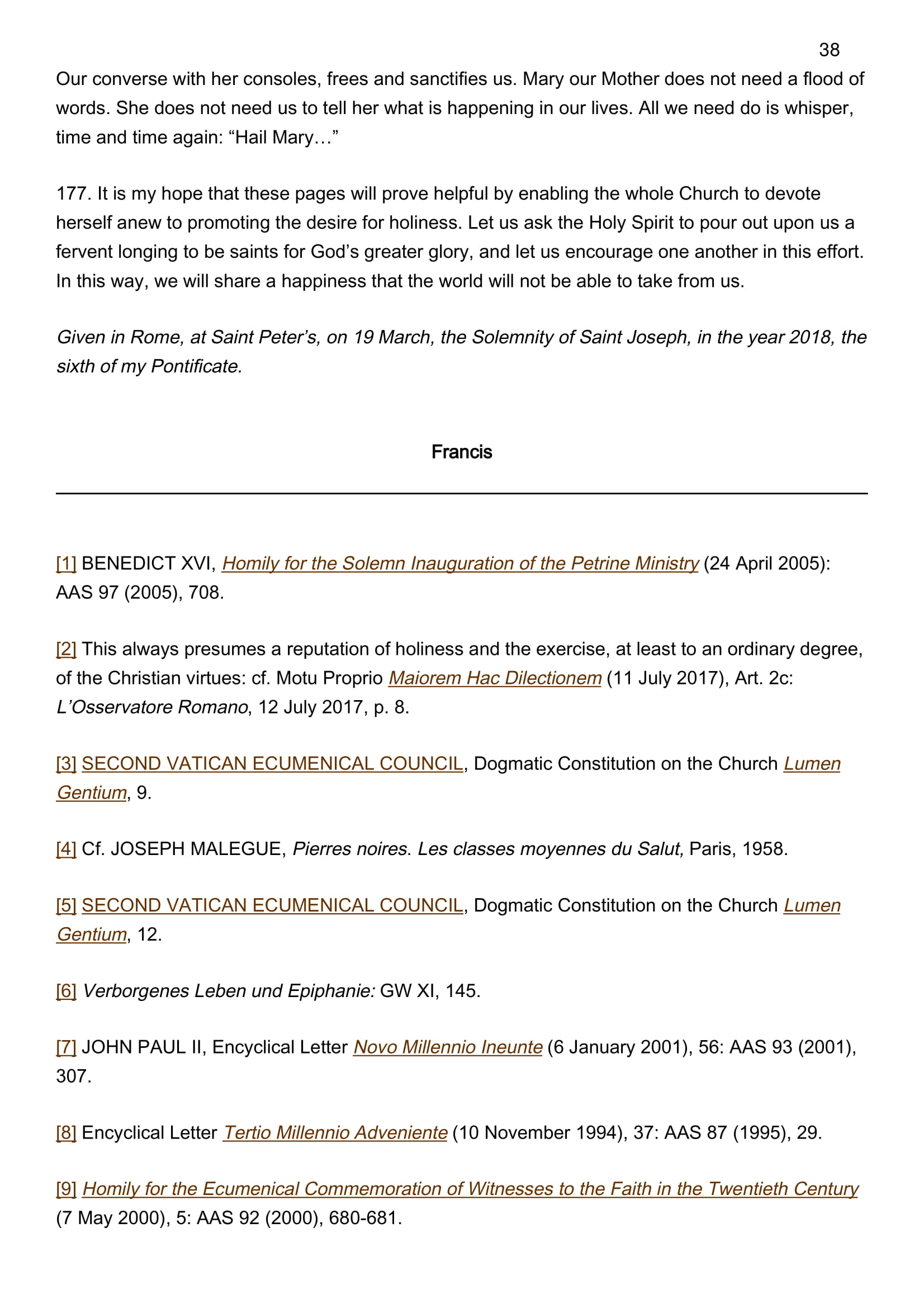 - Bab Satu, Panggilan Kesucian, Orang Kudus yang memberi semangat dan menemani perjalanan kita; pada bab ini terdiri atas 32 ayat dan 2 bab pembuka