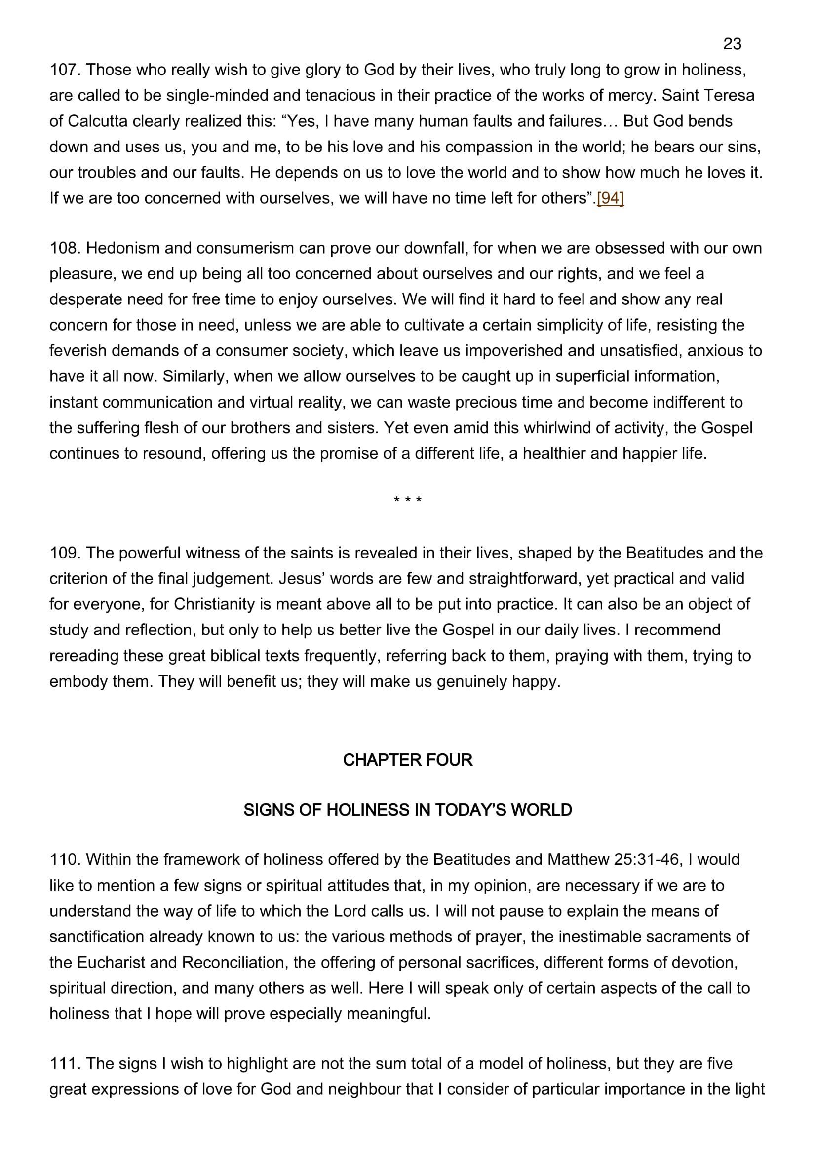 - Bab Empat, Signs of Holiness in Today’s World (tanda-tanda kekudusan di zaman ini), berisi 2 bab pembuka dan Perseverance, Patience, and Meekness (Ketekunan, Kesabaran, dan Kekerasan) sejumlah 10 ayat, 7 ayat mengenai Joy and A Sense Humour (bersukacita dan berselera humor), 11 ayat Boldness and Passion (Keberanian dan Gairah), 7 ayat In Community, dan 11 ayat mengenai In Constant Prayer
