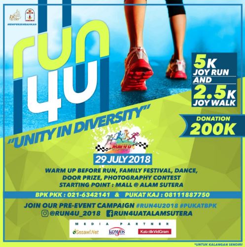 HIDUPKATOLIK.com – Usai misa Jumat pertama, 4/5, panitia dari Komunitas Pukat KAJ (Profesional dan Usahawan Katolik Keuskupan Agung Jakarta) turut mensosialisasikan kegiatan “Run 4 U” Unity in Diversity, direncanakan pada Minggu, 29/7 mendatang di Alam Sutera dengan biaya pendaftaran (donasi) per orang sebesar IDR 200K.