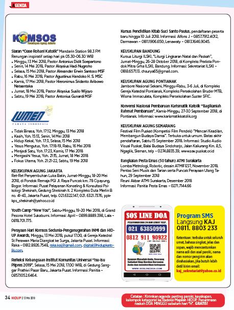 Perayaan Hari Komsos Sedunia-Penganugerahan INMI dan HIDUP Awards, Minggu, 13 Mei 2018, pukul 17.00, di Gereja Katedral St Perawan Maria Diangkat ke Surga, Jakarta Pusat. Informasi: Raka – 0812.8926.7548, [email protected], digital@hidupkatolik.