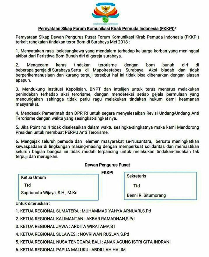 HIDUPKATOLIK.com – Dewan Pengurus Pusat Forum Komunikasi Kirab Pemuda Indonesia (FKKPI) turut menyampaikan surat Pernyataan Sikap terkait rangkaian tindakan teror Bom di Surabaya Mei 2018 :