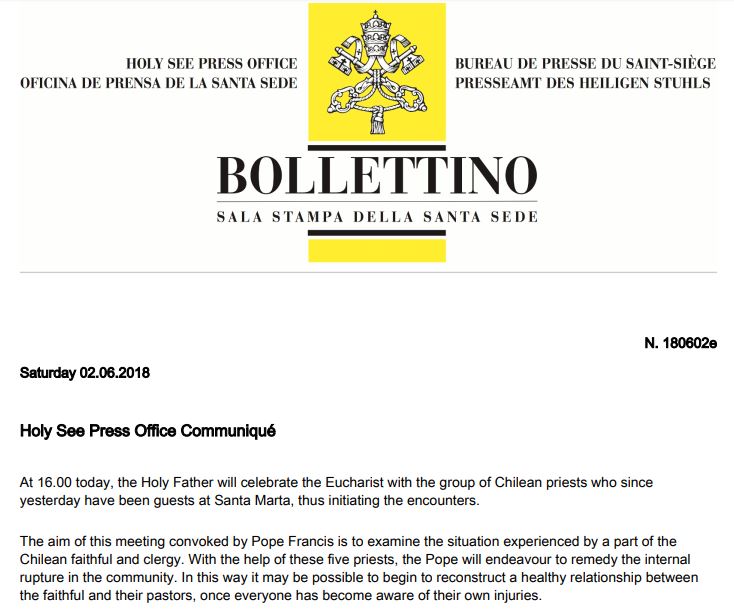 Paus Fransiskus terus meminta dukungan penuh doa sementara Gereja terus melanjutkan perjalanan yang menyakitkan dan sulit ini. Dia mengulangi permintaan itu selama lawatam kunjungannya dengan para uskup Chili di Vatikan bulan lalu.