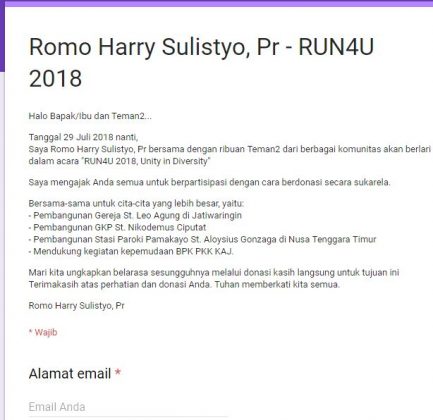 HIDUPKATOLIK.com Menyambut acara “Run 4 U” Unity in Diversity pada Minggu, 29/7 mendatang di Alam Sutera, Tangerang, sejumlah imam yang berkarya di Keuskupan Agung Jakarta (KAJ) turut mendukung acara ini dengan berpartisipasi dalam kegiatan lari dan penggalangan dana.