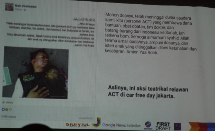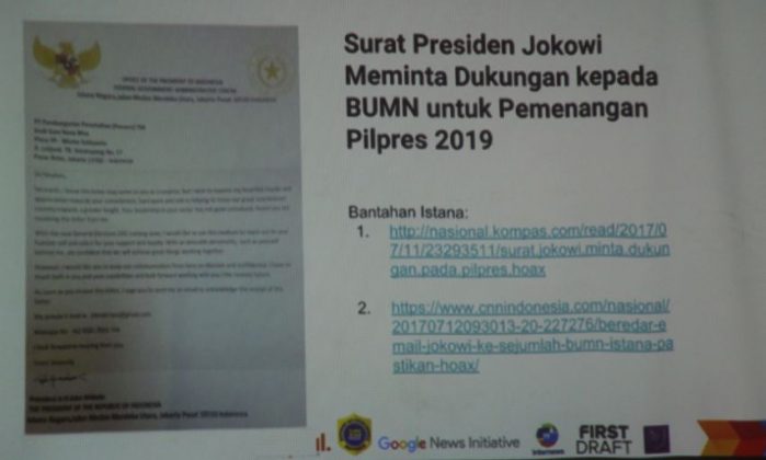 Paparan tersebut menjadi pembuka dalam presentasi yang disampaikan oleh dua narasumber, Afwan Purwanto dan Nurfahmi Budiarto dalam pelatihan dasar yang bertema “Hoax Busting and Digital Hygiene” pada Jumat, 27/7 di Hotel Grand Cemara, Jakarta.