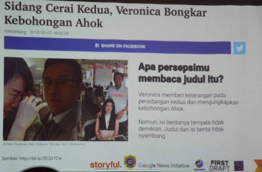 - Gak nyambung. Contohnya berita tentang sidang cerai kedua, “Veronica Bongkar Kebohongan Ahok.”. Kenyataannya adalah Vero tidak pernah datang dalam persidangan.