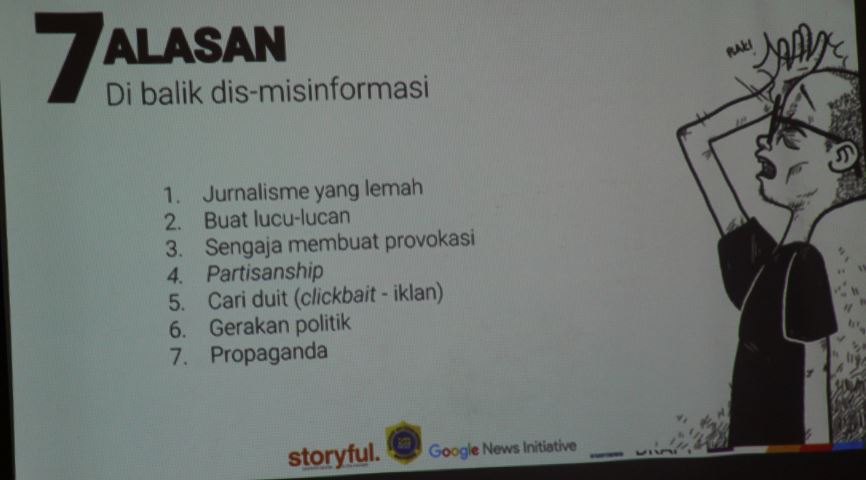 Lantas mengapa terjadi dis-misinformasi? Ada tujuh alasan dibalik dis-misinformasi yang sering beredar, sebagaimana dikemukakan kedua narasumber secara bergantian, yakni jurnalisme yang lemah, membuat lucu-lucuan, sengaja membuat provokasi, partisanship, mencari duit, gerakan politik, dan propaganda.