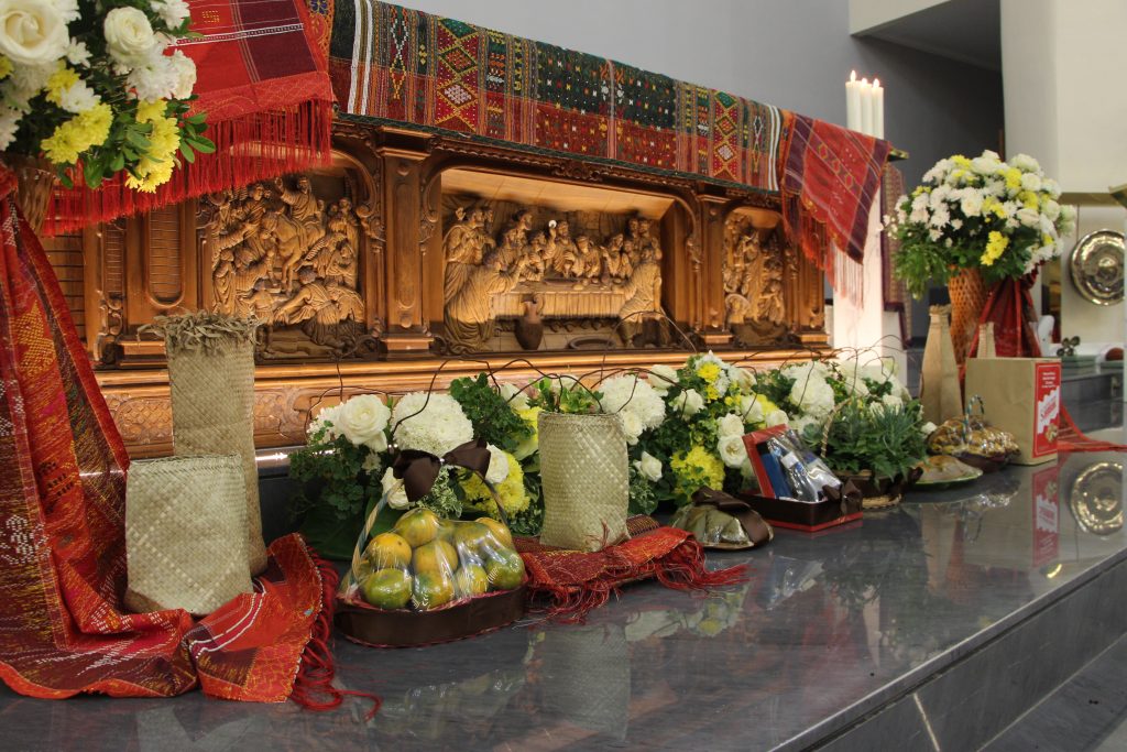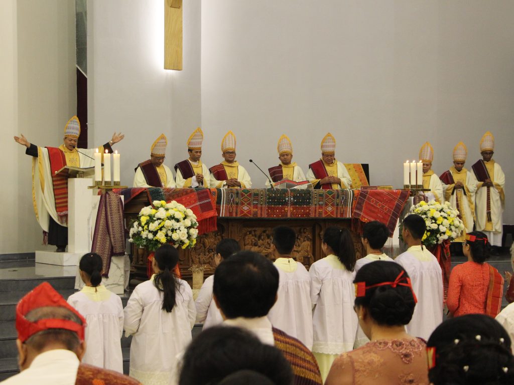 Pastor Andreas Yudhi Wiyadi, O.Carm, kepala Paroki Tomang, memberikan berkat penutup.[HIDUP/Antonius Bilandoro]Para imam mengenakan busana Karo serta diarak dengan tarian Simalungun. Sentuhan nuansa Batak juga tampak dalam bahan persembahan, seperti lapet, kacang sihobuk (disangrai dengan pasir), ikan mas arsik, jeruk Medan, dan beras dalam tandok (wadah yang terbuat dari daun pandan kering dan dianyam).
