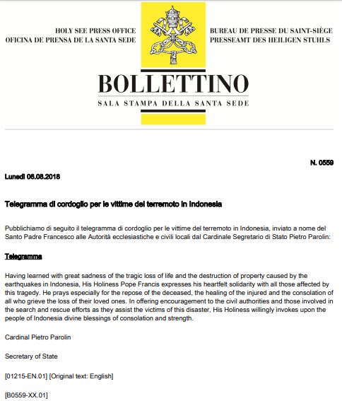 Telegram yang disampaikan oleh Paus Fransiskus pada Senin, 6/8, menyatakan “solidaritas tulus”-nya dengan semua orang yang terkena dampak gempa (sebagaimana dilansir dari vaticannews.va, 6/8, pukul 13:59 WIB). Bapa Suci mengatakan dia merasa sangat sedih ketika diberitahu tentang kehilangan jiwa yang tragis dan kehancuran properti yang disebabkan oleh gempa bumi.