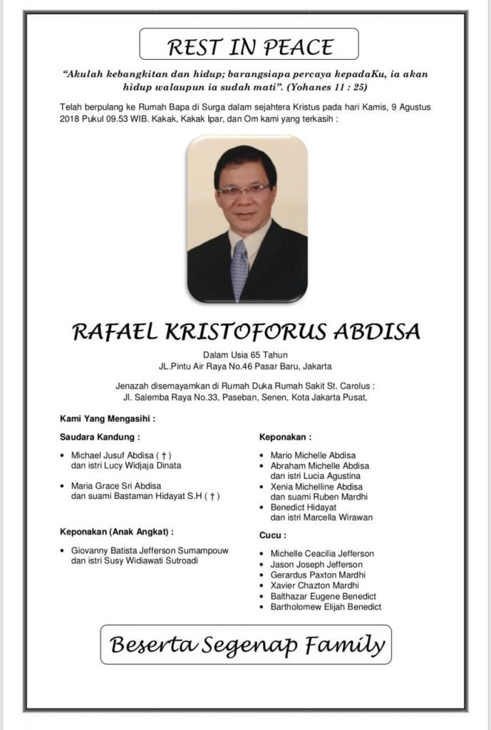 Dilengkapi oleh berita dari WA group Ikatan Konsultan Pajak Indonesia (IKPI) Jakarta Pusat: “Berita duka cita, telah dipanggil ke pangkuan Bapa di Surga: Bapak Rafael Abdisa (Bendahara Umum IKPI) dan Seksi acara Mukernas IKPI 2018, pada hari ini: Kamis, 09 Agustus 2018 di Yogya.”
