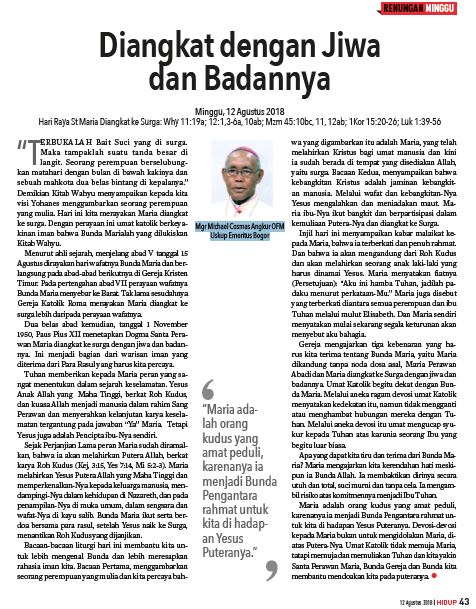 HIDUPKATOLIK.com – Minggu, 12 Agustus 2018 Hari Raya St Maria Diangkat ke Surga: Why 11:19a; 12:1,3-6a, 10ab; Mzm 45:10bc, 11, 12ab; 1Kor 15:20-26; Luk 1:39-56