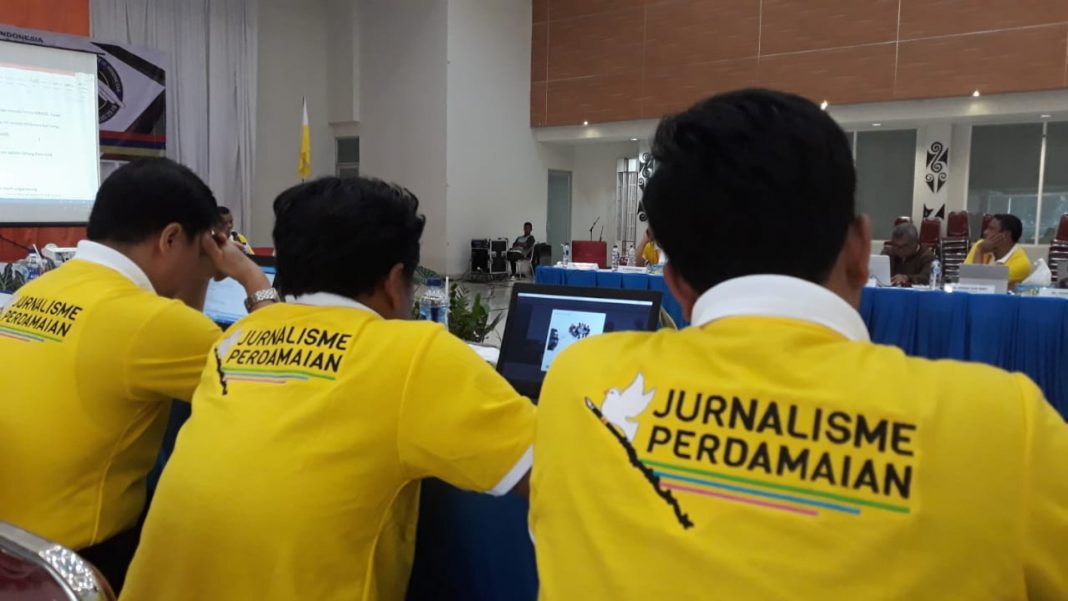 Para peserta yang berasal dari seluruh Keuskupan di Indonesia mengenakan kaos warna kuning. Yang istimewa adalah –tagline di punggung bertuliskan “Jurnalisme Damai”, dengan burung merpati di sisi kanannya.