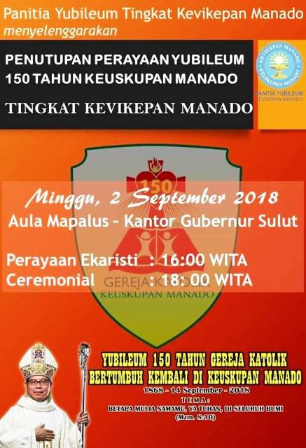 HIDUPKATOLIK.COM-Ribuan umat dan puluhan pastores Kevikepan Manado menggelar Puncak Peringatan Yubelium 150 Tahun Bertumbuh Kembali Gereja Katolik di Keuskupan Manado Tingkat Kevikepan Manado di Gedung Mapaluse Kantor Gubernur Sulawesi Utara, Minggu, 2/9.