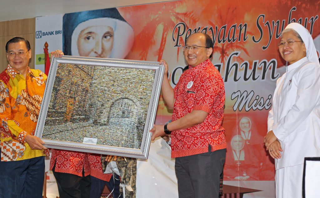 Pimpinan umum Suster-suster CB, Sr Rosaria CB (paling kanan) menyerahkan lukisan foto Biara Induk CB (Pusat Doa dan Refleksi ‘Onder de Bogen’) di Maastricht, Belanda, yang diterima oleh Ketua Perkumpulan Perhimpunan St Carolus (PPSC) Rudyan Kopot (baju kuning) dan Direktur Utama RS Carolus, Dr Endrotomo Sumargono (batik merah), dalam rangka menyongsong seabad RS St Carolus yang akan akan dirayakan pada 21 Januari 2019 mendatang.[HIDUP/Antonius Bilandoro]Perayaan syukur dibuka dengan sendratari yang mementaskan kilas balik sejarah hadirnya karya suster cinta kasih CB di Indonesia.