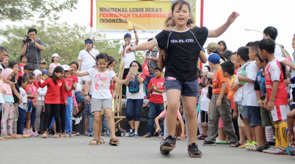 ADA yang berbeda dengan Car Free Day di Alam Sutera, Tangerang, Minggu, 7/10. Sebuah panggung berdiri disertai spanduk berisi ajakan kepada anak-anak untuk mengenal aneka permainan tradisional yang begitu populer pada masa lalu.