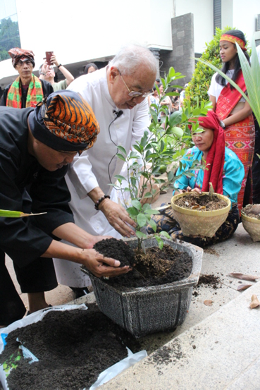 Diawali dengan penanaman tunas pohon kelapa dan tanaman pangan di halaman gereja dekat patung Hati Mahakudus Yesus.