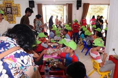 Sedangkan di gedung serba guna Yos Sudarso, lewat acara “Tak Makan, Maka Tak Sayang,” anak-anak BIA (Bina Iman Anak) dan BIR (BIna Iman Remaja) diajak mencicipi dan menyukai penganan khas beberapa daerah di Indonesia seperti kue cucur dan bika ambon, tahu gimbal, pisang ijo, kue talam, klepon, tahu sumedang, dan lainnya.
