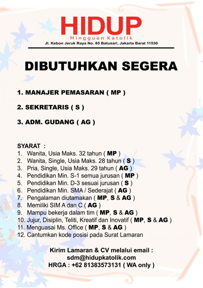 Saat ini Majalah HIDUP membuka lowongan kerja untuk beberapa tenaga profesional di bidang: