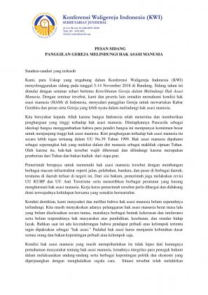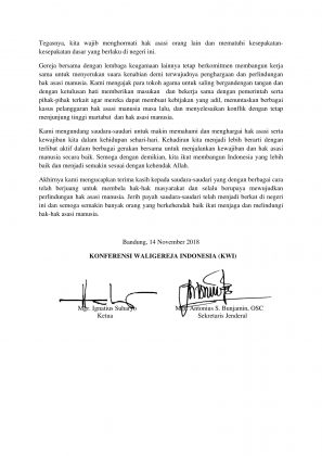 Kami, para Uskup yang tergabung dalam Konferensi Waligereja Indonesia (KWI) menyelenggarakan sidang pada tanggal 5-14 November 2018 di Bandung. Sidang tahun ini dimulai dengan seminar sehari bertema Keterlibatan Gereja dalam Melindungi Hak Asasi Manusia. Dengan seminar tersebut, kami dan peserta lain semakin memahami kondisi hak asasi manusia (HAM) di Indonesia, menyadari panggilan Gereja untuk mewartakan Kabar Gembira dan peran serta Gereja yang lebih nyata dalam melindungi hak asasi manusia.