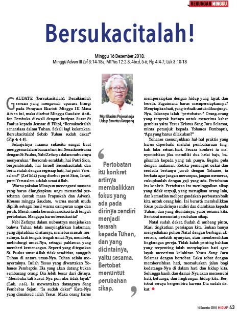 GAUDATE (bersukacitalah). Demikianlah seruan yang mengawali upacara liturgi pada Perayaan Ekaristi Minggu III Masa Adven ini, maka disebut Minggu Gaudate. Antifon Pembuka diawali dengan kutipan Surat St Paulus kepada Jemaat di Filipi, “Bersukacitalah senantiasa dalam Tuhan. Sekali lagi kukatakan: Bersukacitalah! Sebab Tuhan sudah dekat” (Flp 4: 4-5).